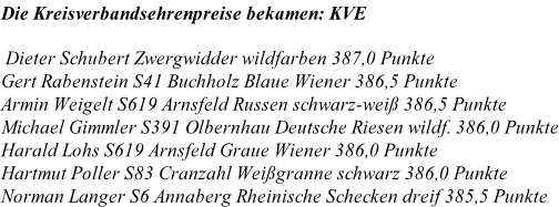 Die höchste Zuchtgruppe der 83. Kreisschau Annaberg wurden die Tiere von Zuchtfreund Dieter Schubert mit Zwergwidder wildfarben und 387,0 Punkten.
