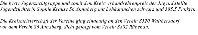 Die höchste Zuchtgruppe der 83. Kreisschau Annaberg wurden die Tiere von Zuchtfreund Dieter Schubert mit Zwergwidder wildfarben und 387,0 Punkten.